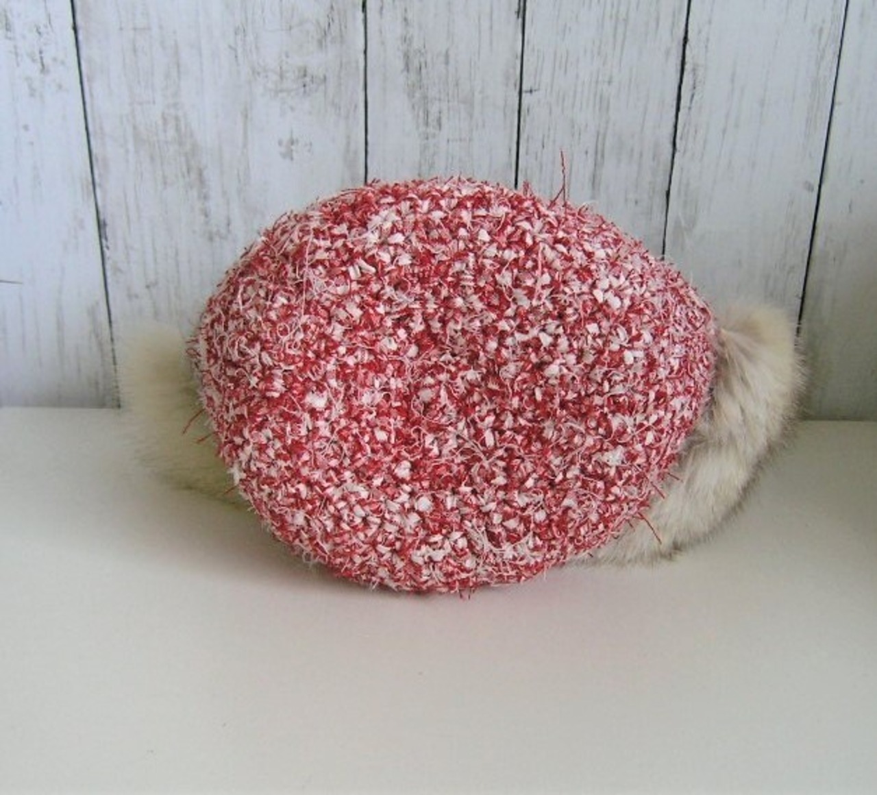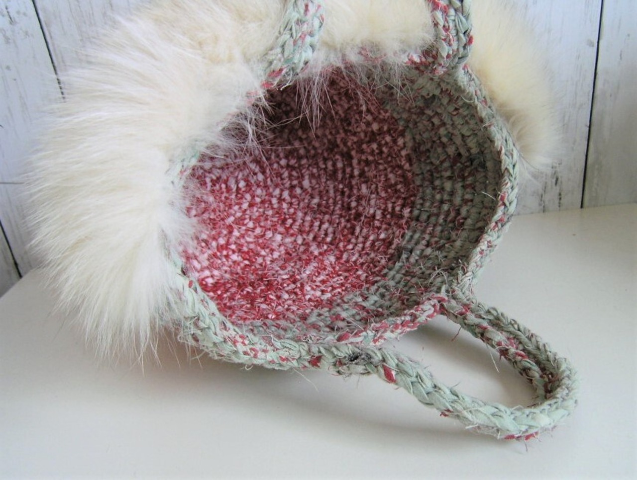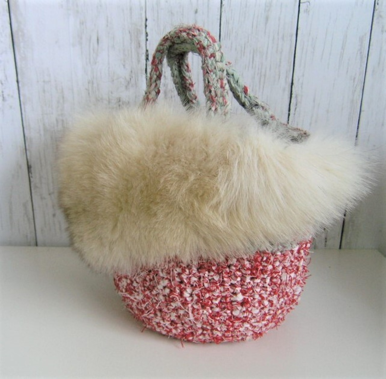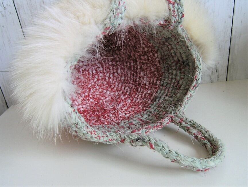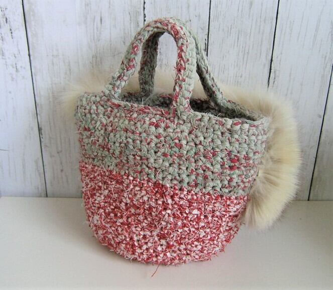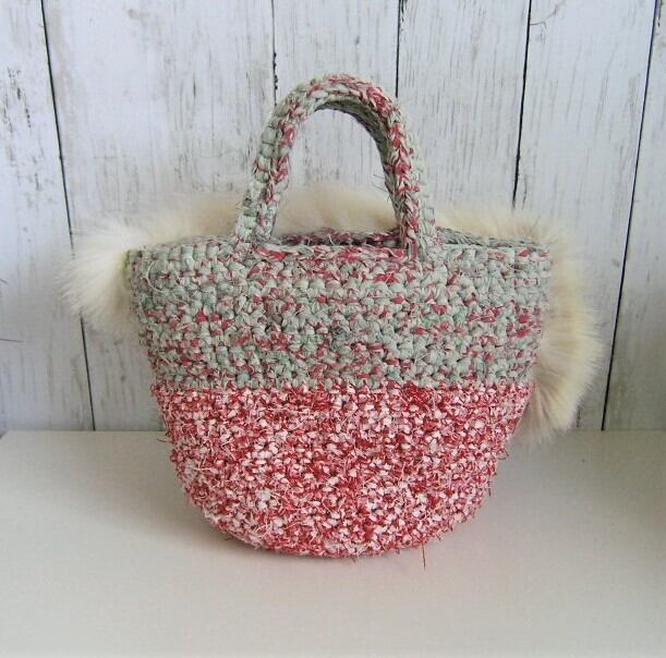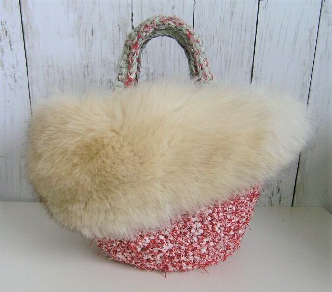 裂いた布を紐状にした素材で編んだバッグにフォックスファーを大胆に飾り付けた1点ものです。