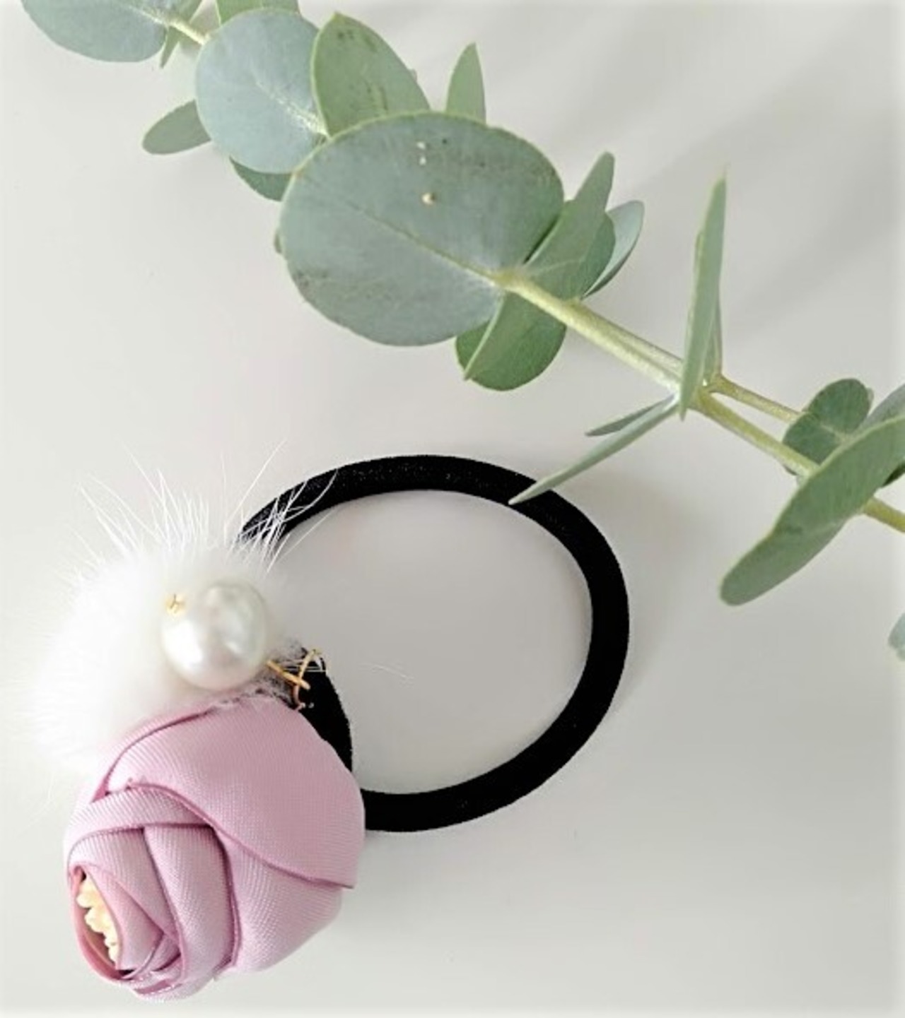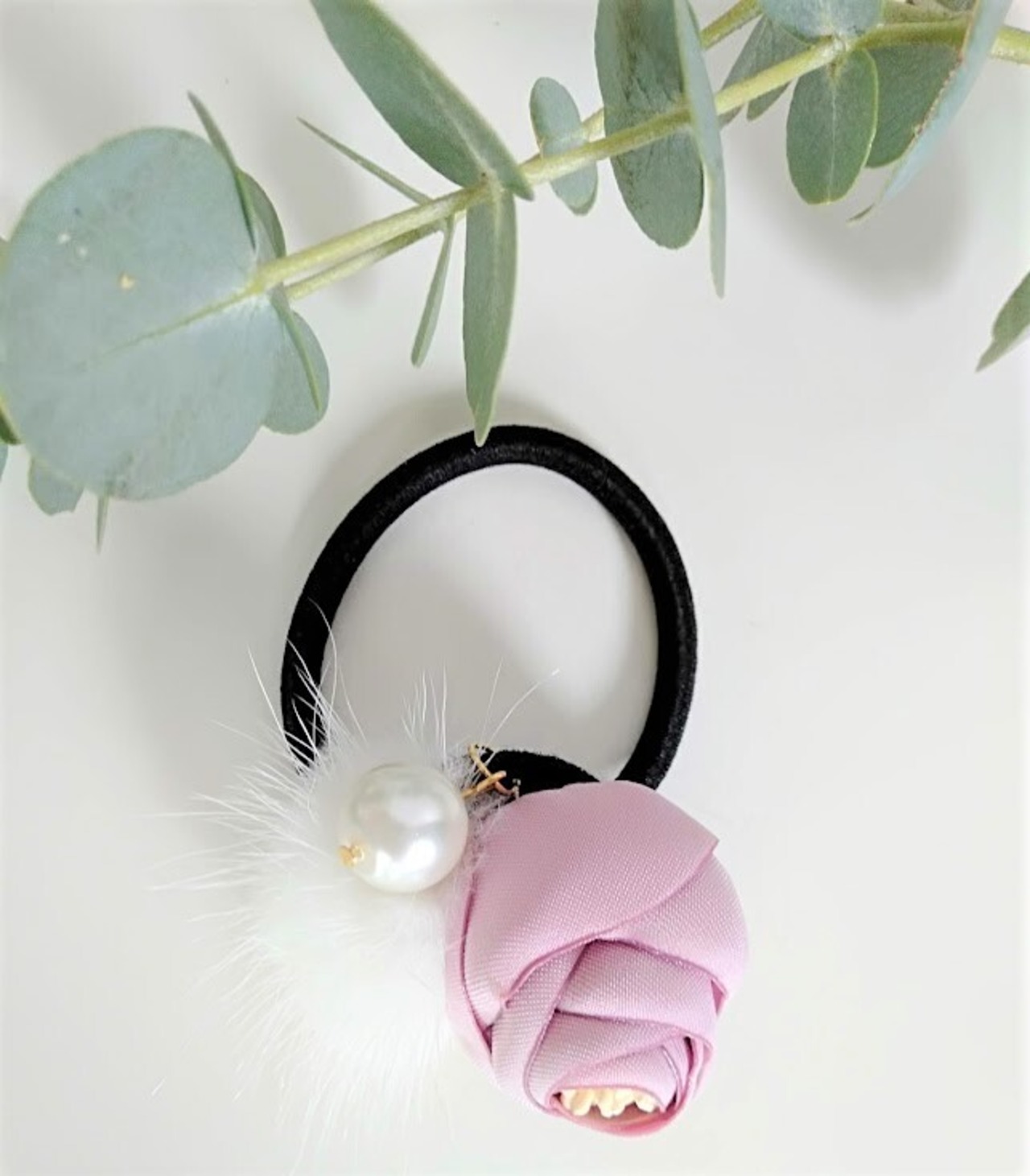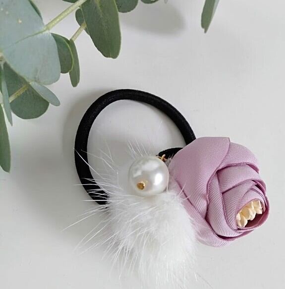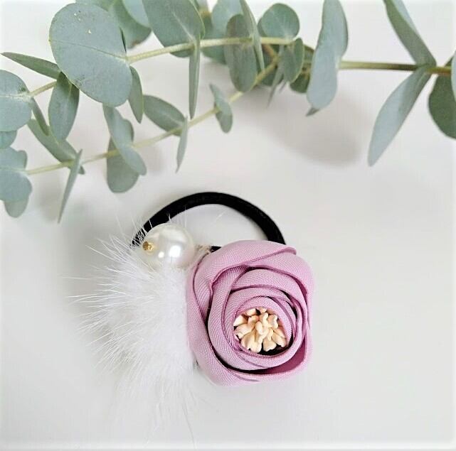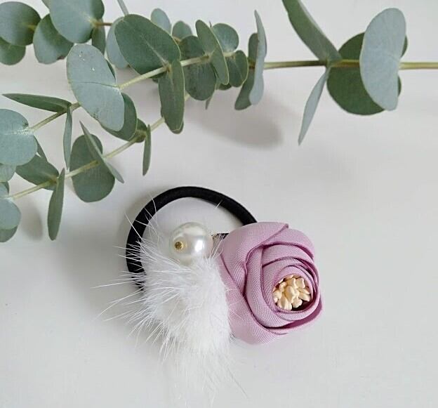 可憐な花のモチーフにパールとホワイトミンクを合わせた華やかなヘアゴムです。 現定数 5 お早めにどうぞ!!!