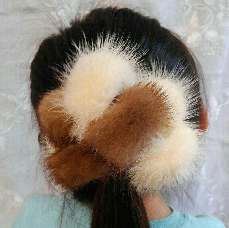 直径4cmのリング状にしたミンクファーを8個、長さ19cmのヘアゴムシュシュに通しています。